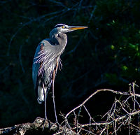 The great blue heron is a opportunistic feeder, eating mainly fish, but will devour almost anything edible that comes within striking distance. It tends to stand very still waiting for its prey to come to it. You will see it wading slowly, up to belly deep in water, or standing like a statue.