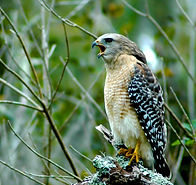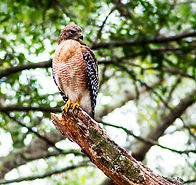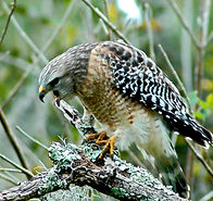 Red shouldered hawks (buteo lineatus) can be found in deciduous woodlands near rivers and swamps from eastern Canada and the United States down into Mexico and along the coast of California and Baja California.They soar over or through forests or perch on tree branches searching for prey. They are a medium distance migrant in the upper part of their range during the winter and resident in the rest of their range.
